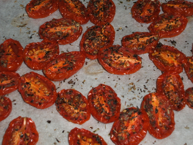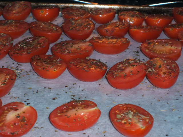 ·        Halve tomatoes.  Spread them single layer, cut side up, on lined tray.