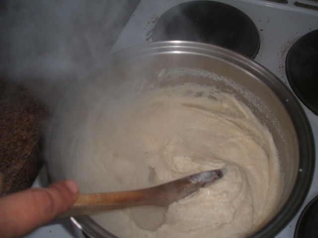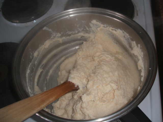 · Reduce heat and stir in semolina. Cook, stirring, until very stiff.