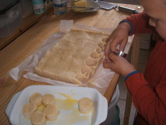 · Cut semolina into rounds using a biscuit cutter. The usual size is 4 cm, but I like to make them smaller (I have a 2 cm cutter) for the kids.