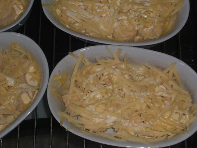 Step Six: Sprinkle with a little cheese and if you like, drizzle with cheese. I use small dishes so I can easily freeze what we don't use. |